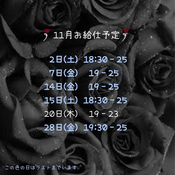 岐阜 Rosera Cafe固定雨月しあ🥀ロゼラカフェ - RoseraCafe - 岐阜コンカフェ@RoseraCafe_16·𓏲𓎨 11月のお給仕予定 𓏲𓎨 11/17 うてんちゃん🎂 今月はほとんどラストまでいるよ>ω</♥冬っ!って感じになってきてお散歩が寒くなる時期だ~💧🍂体調に気をつけてね、今月も会えるの楽しみにしてます🎀 ※変更の可能性あり152