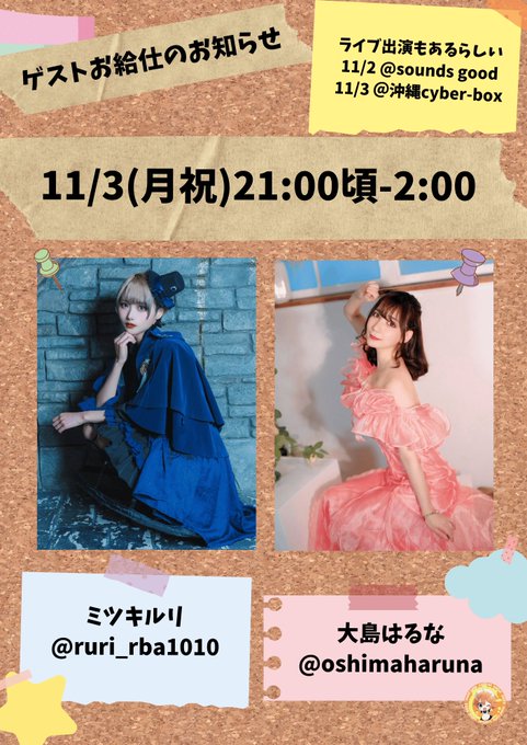 沖縄・那覇 メイドカフェ coffret 沖縄那覇店メイドカフェcoffret沖縄那覇店🌺コフレ@naha_coffret·1時間本日です🌺🐠🌊👙☀️💖 ゲストさんへも遠隔できます🥂 https://nahacoffret.booth.pm引用メイドカフェcoffret沖縄那覇店🌺コフレ@naha_coffret·10月31日🦄💎🦄💎🦄💎🦄 大島はるな(@oshimaharuna ) ミツキルリ(@ruri_rba1010 ) ゲストお給仕🫖 11/3(月祝)21:00-2:00 💎🦄💎🦄💎🦄💎 恵比寿coffretプロデューサー大島はるな ミツキルリが来沖🌺✨ この機会に乾杯しましょ🥂 2(日)3(月)ライブ出演もあり〼 #大島はるな #ミツキルリ #沖縄 #モンパレ沖縄211