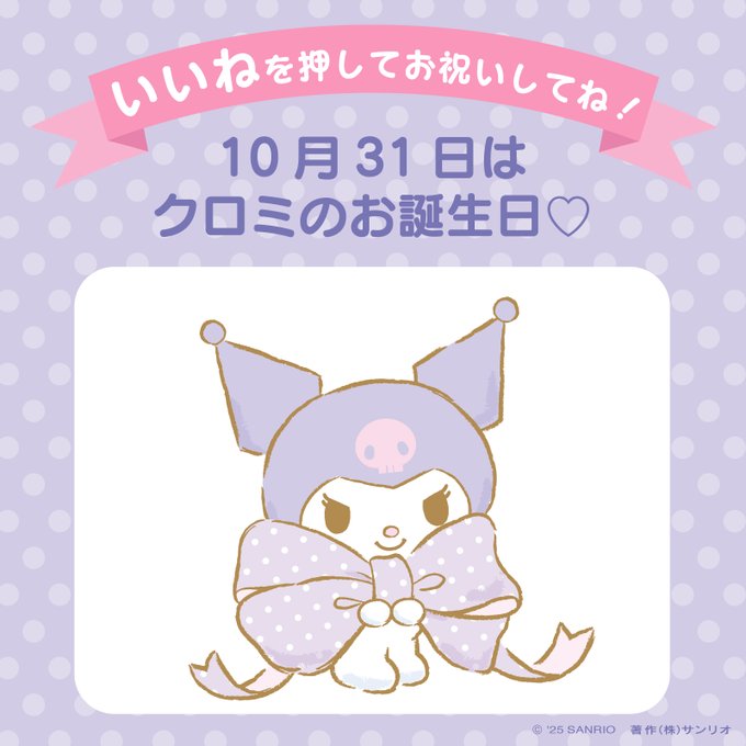 岡山 ちよにやちよにもね 11/15生誕さんがリポスト正方形のプロフィール画像サンリオ【公式】@sanrio_news·⋆⸜ #サンリオキャラにおめでとう ⸝⋆ 「いいね」を押してお祝いしてね! 10月31日は #クロミ のお誕生日♡ 実はとっても乙女チック!? イケメンがだ〜い好きで 恋愛小説にはまっているんだって♪ https://sanrio.lnky.jp/fE6qYrk1696,0022.2万44万