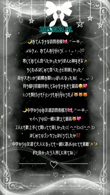 岡山 Luna Charme ~ルナシャルム~なつめ@natsume_710_·10月25日✦⋆⋆ 2025.10.24 Fri. ⋆⋆✦ へーかいしてます𐔌՞⁔⸝⸝ɞ̴̶̷ ̫ ᴗ̤⸝⸝⁔՞𐦯ᯤ♡ ☪︎┈┈┈┈┈┈‧✧̣̥̇‧┈┈┈┈┈┈┈☪︎0:06引用なつめ@natsume_710_·10月24日にゅーかい.ᐟ おでん食べよ🍢 #岡山コンカフェ #コンカフェ #コンカフェ嬢 #自撮り界隈 #地雷系女子4147