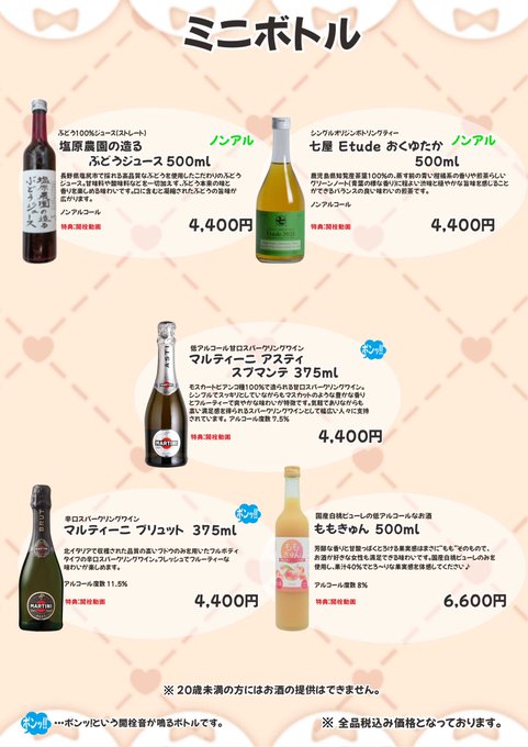 静岡・浜松 プレミアムメイドバー ツインテールういは🌸ツインテールさんがリポストプレミアムメイドバー🌸ツインテール (静岡コンカフェ)@TT_Maid·【ミニボトルの一部価格改定と新商品のご案内】 「塩原農園の造るぶどうジュース」ですが、原価値上げのため本日より4,400円とさせていただきます。 そして同じ価格のノンアルミニボトルとして七屋のボトリングティーである「Etude おくゆたか」を新しくラインナップいたしました!さらに表示34558