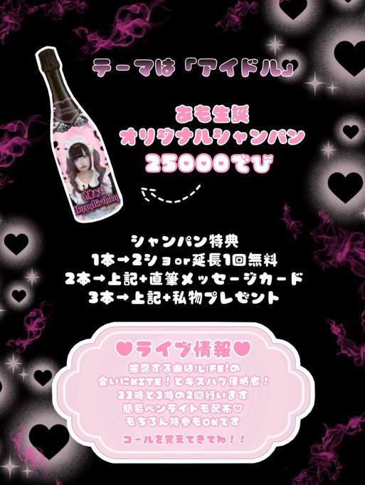 福岡西新コンカフェ♡小悪魔メイドBARらぶでびる@Love_smalldevil·🖤あも生誕祭のお知らせ🖤 あも生誕オリシャン限定15本!1本20000でびでご用意してます!! らぶでび初のライブタイムもあるので詳細は2枚目の画像をチェックして下さい🥺 あもちゃん㊗️20歳なのでぜひ少しの時間でも足を運んでくれると嬉しいです💖💖まってるデビ!😈33296