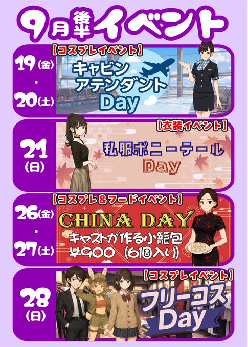 固定さゆ@dearmy_sa_yus·9月後半出勤予定 17日 19:00~21:30 20日 15:00~21:30 キャビンアテンダント 24日 19:00~21:30 27日 15:00~21:30 ちゃいな 29日 19:00~21:302141