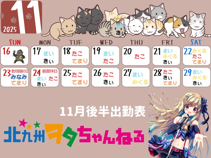 北九州・小倉・黒崎 北九州ヲタちゃんねる北九州ヲタちゃんねる🎤【アニソンバー】@kitaq_otach·🎶本日の出勤情報🎶 まい🐱 @mai_Otach きぃ🐦⬛ @Kiiiiiika1101 ✨ご来店お待ちしております🧚28470