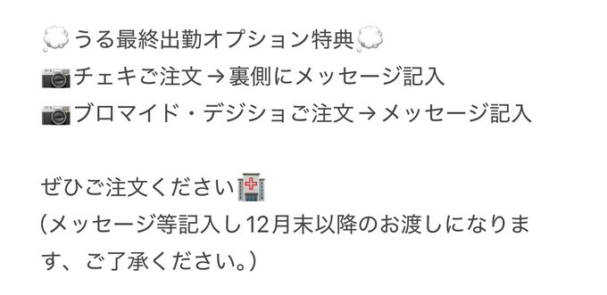 天神 I♡Heart cafeくろえ🐈⬛ I♡Heartcafe@Iheart_chIoe·11月18日クリスマス一緒に過ごそう♡♡ トレカ&アクキーぜっっったい可愛くするので𝑮𝑬𝑻してくださいナ、、(՞⸝⸝› ̫ ‹⸝⸝՞)♡12月から価格改定されるので今月中の予約がお得です♬.*゚引用I♡Heart cafe🏥福岡天神ナースコンカフェ@I_Heartcafe·11月18日🎅クリスマスイベントのお知らせ🎅 下記日程の間でシャンパン類をご予約いただいた患者様へ値段によって異なる特典をプレゼントいたします🎁 ご希望の患者様は当DMへ【クリスマス】とお送りくださいませ。 また、12月よりシャンパン類の価格改定を予定しております。さらに表示7437
