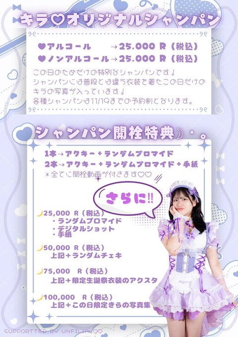 天神 親不孝♡♡(あんふぃりあるルキルキ)親不孝♡♡@unfilial_cafe·アイドルきら♡♡ オリジナルシャンパンデザイン完成🥂 ご予約期限は11/19(水)です! ご予約はこちらの公式Xまで お気軽にDMくださいっ❤︎₍ᐢ·͈༝·͈ᐢ \┌iii┐⋆ʜᴀᴘᴘʏʙɪʀᴛʜᴅᴀʏ⋆┌iii┐ / 〰 〰 ☽アルコール 11/29のきらの生誕際に相応しい可愛く 上品なプリンセスデザインです♪さらに表示きら💫11/29生誕16182,657