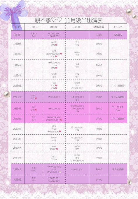 天神 親不孝♡♡(あんふぃりあるルキルキ)きら💫11/29生誕さんがリポスト親不孝♡♡@unfilial_cafe·\ にゃっ / ฅ^•ω•^ฅ♡ ╭──────────────. ˡºᵛᵉ❤︎ ╮ 11月後半の親不孝♡♡アイドル出演表✨ ╰ ˡºᵛᵉ❤︎.─────────────╯ #福岡コンカフェ #天神コンカフェ #福岡イベント #女子会 #福岡デートならかさんと他9人8101,118