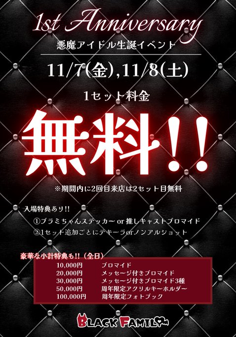 天神 BlackFamilyめるさんがリポストBLACKFAMILY😈悪魔アイドルコンセプト 福岡春吉コンカフェ@BlackFamily_off·返信先: @BlackFamily_offさん本日より2日間 😈1セット無料!!😈 💎入場特典💎 ①ブラミステッカーorキャストブロマイドプレゼント🎉 ②1セットごとにテキーラorノンアルショットプレゼント🎉 さらに... 豪華な入場者特典も✨22265