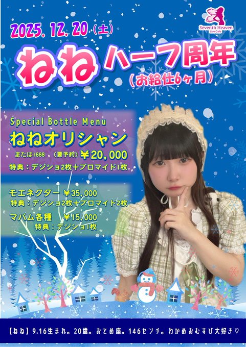 久留米 ライブカフェ セブンスヘブンみこ@ななカフェさんがリポストねね@ななカフェ@7th_nene0916·🎀お知らせ🎀 12/20(土)は ねねハーフ周年っ🐼💞 半年生き残ったぞ〜!!笑 ななカフェやTikTokライブに会いに来てくれありがと!沢山の出会いに心から感謝です😽🌟 オリシャンのご予約はねねのDMからもOK🍾💞 締切は12月10日までだよっ!146526