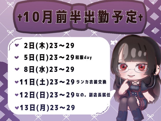固定ぬう@dearmy_nuu·꒰ 10月前半会える日 ꒱ †7日 23-5 †10日 24-5 うさメイド🐰 †13日 23-5 とてもすくない、出勤日で早く出てほしいとことかあったら連絡ください予定まってますT ˙̫ T273