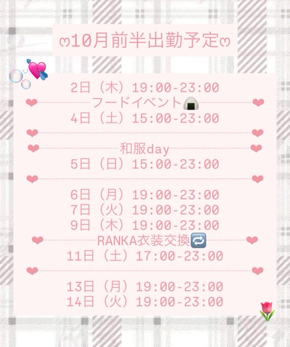 固定るい@dearmy_rui·❦10月前半出勤予定❦ 前半は出勤たくさん❣なの。ちゃま副店長就任含めいろいろ楽しみだ〜〜🫶5110