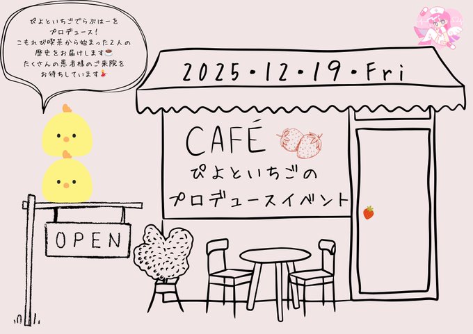 天神 I♡Heart cafeいちご🍓 12/27生誕卒業🌸@Iheart_ichigo·58分ぴよさま。とプロデュースイベントさせて頂くことになりました👑 いつしかのこもれび喫茶でのわちゃわちゃをお届けできる機会を設けれると思ってなかったのでわくわくしてます!引用I♡Heart cafe🏥福岡天神ナースコンカフェ@I_Heartcafe·1時間🍓ぴよといちごのプロデュース👑 12/19(金)に開催いたします! 限定フードなどをご用意してお待ちしております♡ 院内にはバージョンの異なる告知画像が…!?どちらもぴよナースが作成してくれているのでぜひチェックしてください✅298