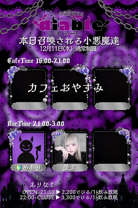 天神 小悪魔カフェdiableやみ😈↝ † 小悪魔カフェディアブル@ymrm_01·✝️12月後半来店予定募集✝️ 12/19~21 軍服ロリータ 12/24~12/28 クリスマスイベント 12/29~(31) 年末年越しイベント (30まで通常営業予定、31、1は予定のみ) 13日中に連絡ください‼️GIF198
