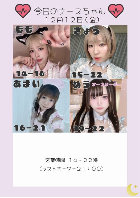 天神 I♡Heart cafeきょう🎰I♡Heart cafeさんがリポストI♡Heart cafe🏥福岡天神ナースコンカフェ@I_Heartcafe·💉12月12日(金)の出勤情報💉 私服でお出迎えいたします🏥 🍓いちごオリシャン予約受付最終日 ❄️冬メニュー発売中 営業時間 14:00〜22:00(L.O.21:00) ご来院お待ちしてます♡ #福岡コンカフェ #天神コンカフェ🐈I♡Heart cafeさんと他3人21231