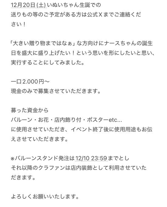 天神 I♡Heart cafeみり💘I♡Heart cafe@Iheart_miri·5時間いぬいちゃん生誕のクラファン、バルスタ立てれる締切が今日までみたいです🎀現金以外も大丈夫みたいなので、ぜひ🦴♡引用🐈I♡Heart cafe@Iheart_neco·12月5日いぬいちゃんのクラファン募集致します! よろしくお願い致します🤍9306