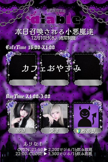 天神 小悪魔カフェdiable愛す@ice_orz_·13時間キャバどれらしいᐠ( ᐢ ᵕ ᐢ )ᐟ引用小悪魔カフェ diable 😈福岡天神 コンカフェ ディアブル@diable0610·22時間12/10(木)21:00-3:00 😈本日召喚される小悪魔たち😈 衣装 BAR 21-3 あさ@yoru_hgh 愛す@ice_orz_ 🔰めあり@mary_diable @Erina_diable ✝️お問い合わせ応募 http://lin.ee/yi0glA1156