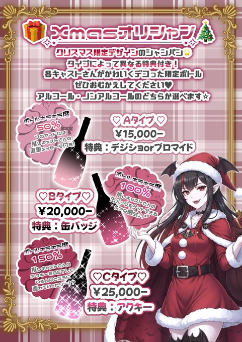 天神 DearMy… 𐕣でぃあまい𐕣ぬう@dearmy_nuu·12月10日クリスマスオリシャン出ます✨✨✨ ぬう17.21.23.24います! キラキラオリシャン予約してください;;特典もあります;; 予約したるよー!って方はDMお願いします🥲💕引用Dear My…♱でぃあまい♱【福岡天神】ヴァンパイアメイドBAR@dearmy2025·12月9日⋆⸜ 12/17~12/25限定 ⸝⋆ クリスマスオリシャン販売🎄 タイプによって異なる特典と推しキャストさんオリジナルのボトルデコ🌟 限定デザインのシャンパンで一緒にクリスマスを楽しみませんか❔💭 ノンアルコールもご準備しております👍🏻 ̖́- ※さらに表示4232