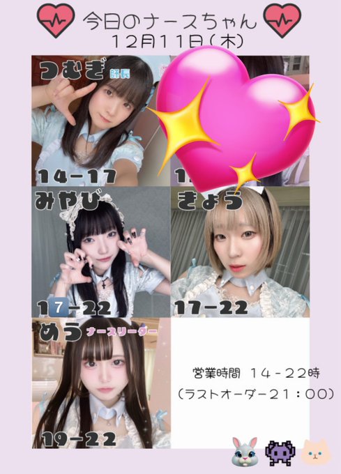 天神 I♡Heart cafeりんね⚡️I♡Heart cafe@Iheart_rinne·2時間😭😭😭キャスト権限使って残りの出勤全部被るようにしたい;;引用I♡Heart cafe🏥福岡天神ナースコンカフェ@I_Heartcafe·12月9日💎ちゅりナース卒業・最終出勤のお知らせ💎 オープンより長い間頑張ってくれていたちゅりナースですが、この度学業の関係により卒業することとなりました。 最終出勤日は2/7(土)となります。 卒業まで僅かではありますがよろしくお願いいたします。1171