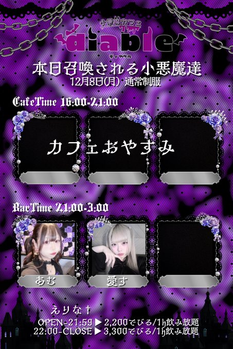 天神 小悪魔カフェdiableえりな 😈天神コンカフェ diableさんがリポスト小悪魔カフェ diable 😈福岡天神 コンカフェ ディアブル@diable0610·12/9(火)店休日 😈本日召喚される小悪魔たち😈 本日【店休日】ですので魔界の扉は開いておりません。明日から通常営業です💜💜 @Erina_diable ✝️お問い合わせ応募 http://lin.ee/yi0glA1183