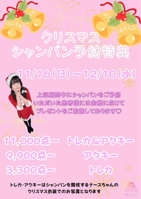 天神 I♡Heart cafeころね👼🏻I♡Heart cafe@Iheart_korone·11時間あしたまでです😭 サンタコスかわいい衣装で撮ったからぜひどちらもげっとしていただきたいです🎀 ほーんとにかわいいから!!(重要) 心を込めて開栓させていただきます👼🏻 シャンパンメニューはこちらのリンクのメニュー表というところをご覧ください♩ ♡https://pont.co/u/iheartcafe♡引用I♡Heart cafe🏥福岡天神ナースコンカフェ@I_Heartcafe·11月18日🎅クリスマスイベントのお知らせ🎅 下記日程の間でシャンパン類をご予約いただいた患者様へ値段によって異なる特典をプレゼントいたします🎁 ご希望の患者様は当DMへ【クリスマス】とお送りくださいませ。 また、12月よりシャンパン類の価格改定を予定しております。さらに表示4342