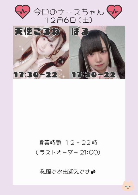 天神 I♡Heart cafeぱる🌷I♡Heart cafe@iheart_paru·3時間明日、17時半~ラストまでいます!! 私服少なすぎて何着るか迷ってる、、 インフルとか風邪流行ってるから皆さんも体調には気をつけてね、、⊃ ̫ ;引用I♡Heart cafe🏥福岡天神ナースコンカフェ@I_Heartcafe·4時間💉12月6日(土)の出勤情報💉 🍓いちごオリシャン予約受付中(12.12まで) 🦴いぬいオリシャン予約受付中(12.7まで) 🎄クリスマスシャンパン予約受付中(12.10まで) ❄️冬メニュー発売中 営業時間 12:00〜22:00(L.O.21:00) ご来院お待ちしてます♡ #福岡コンカフェ #天神コンカフェ43
