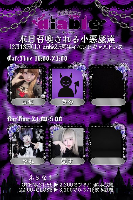 天神 小悪魔カフェdiable小悪魔カフェ diable 😈福岡天神 コンカフェ ディアブル@diable0610·12/13(土)16:00-5:00 😈本日召喚される小悪魔たち😈 🎉diable2.5周年イベント🎉 衣装 CAFE 16-21 ロゼ@roze_diable ちの@chino_diable BAR 21-5 やみ@ymrm_01 愛す@ice_orz_ @Erina_diable ✝️お問い合わせ応募 http://lin.ee/yi0glA123266
