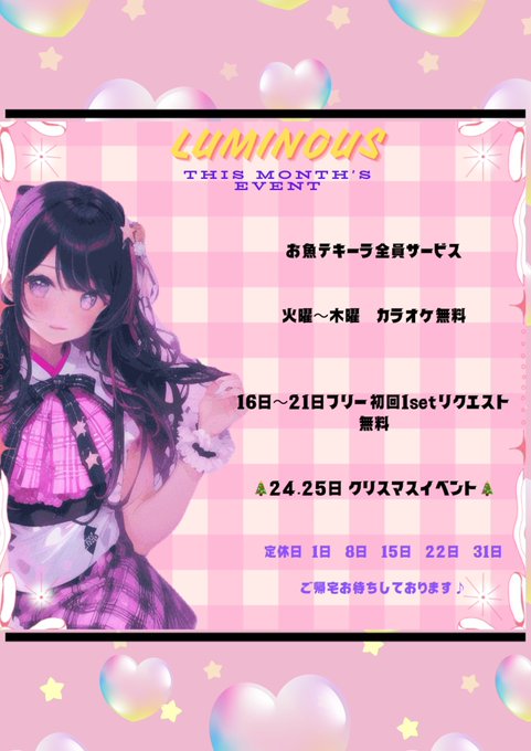 北九州・小倉・黒崎 コンカフェ&バー ルミナス小倉店コンカフェ&バーLUMINOUS 小倉店@LUMINOUS093·12月 12日 (金) ୨୧ お給仕キャスト ୨୧ こあ @coa_Luminous ある@Luminaus_aru なぎさ@Nagi_luminous みか@Mika_LUMINOUS しいな@shina_Luminous あまり@Amari_Luminous ことり@kotori_Luminous かれん@karen_Luminous みじゅ@Mijyu_Luminous うるにゃ@urunya_Luminasuさらに表示5180