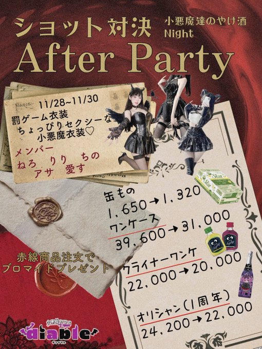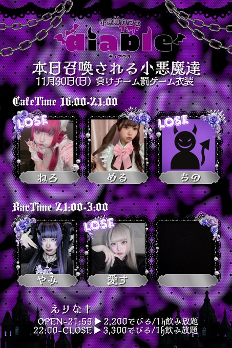 天神 小悪魔カフェdiableやみ😈↝ † 小悪魔カフェディアブル@ymrm_01·2時間います!二日酔い!引用小悪魔カフェ diable 😈福岡天神 コンカフェ ディアブル@diable0610·2時間11/30(日)16:00-3:00 😈本日召喚される小悪魔たち😈 ショット対決負けチーム罰ゲーム衣装🖤⋆͛*͛ 衣装 Cafe 16-21 ねろ@nero_diable める@mel_diable ちの@chino_diable BAR 21-3 やみ@ymrm_01 愛す@ice_orz_ @Erina_diable ✝️お問い合わせ応募 http://lin.ee/yi0glA1123