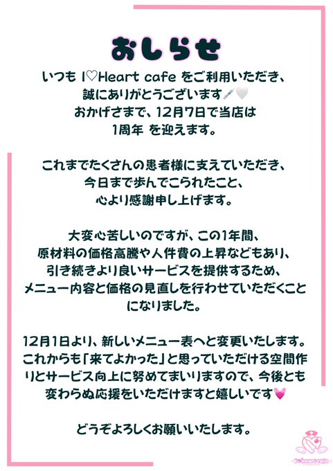 天神 I♡Heart cafeI♡Heart cafe🏥福岡天神ナースコンカフェ@I_Heartcafe·📢メニュー表改定のお知らせ📢 愛されるお店づくりを行なっていきますので今後ともよろしくお願いいたします🩷14241,325