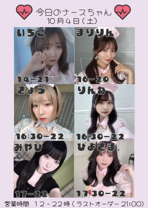 I♡Heart cafe🏥福岡ナースコンカフェ@I_Heartcafe·30分ぴよさまお休みです引用I♡Heart cafe🏥福岡ナースコンカフェ@I_Heartcafe·18時間💉10月4日(土)の出勤情報💉 🍁秋メニュー発売中🍁 🎃ハロウィンキャンペーン開催中🎃 営業時間🏥 12:00〜22:00(L.o21:00) ご来院お待ちしてます🤍130