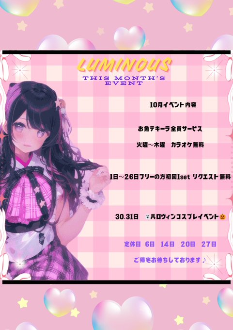 コンカフェ&バーLUMINOUS 小倉店@LUMINOUS093·10月 4日 (土) ୨୧ お給仕キャスト ୨୧ るな@luna6_mx619 こあ @coa_Luminous にこ@nico__Luminous える@Elu_Luminous しお@shio_LUMINOUS しいな@shina_Luminous ことり@kotori_Luminous りあ@Ria_Luminous みじゅ@Mijyu_Luminous 本日もご帰宅お待ちしておりますꔛ♡ #小倉コンカフェさらに表示24105