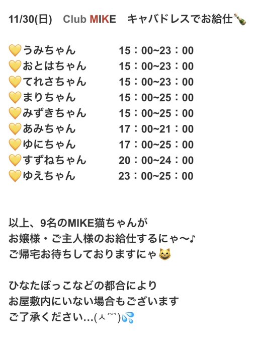 MIKECAFE(ミケカフェ)@MIKE_NOMINE·Club MIKE2日目、寒いなかオープン前からお並びいただいたご主人さまありがとうございます🙇‍♀️ 昨日は満席が続きでご帰宅出来なかったご主人さま大変失礼いたしました🙇‍♀️ 本日はまだ若干お席空いておりますのでご帰宅お待ちしておりますにゃ💋3118