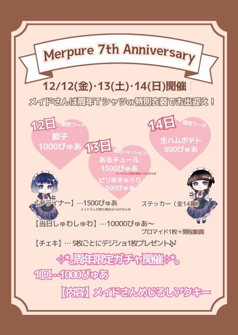 メイド喫茶 えんじぇる໒꒱ぴゅあさんがリポストらむ@えんぴゅあ@angelpure_ramu·4時間おきゅいん! えんぴゅあにNEW❣️デコレーションが増えたので見にきてね👀引用メイド喫茶 えんじぇる໒꒱ぴゅあ@angelpure_cafe·13時間11月30日︎ にちようび 🎀お給仕情報🎀 19-0ましゅ 21-0.5らむ 22-2ひめ 23-2あんじゅ ໒꒱o+:;;;:+o꒱o+:;;;:+o໒꒱o ご主人様&お嬢様のご帰宅お待ちしております💗19329