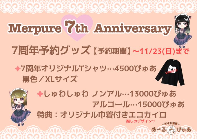広島 メイド喫茶めーるぴゅあメイド喫茶 めーる໒꒱ぴゅあさんがリポストリカ@めるぴゅあ@rika_merpure·9時間カレンダーと合わせて、めるの周年予約も本日までです!🌟 ぽこさんが描いてくださったTシャツめちゃくちゃかわいいです( ; ; )めちゃくちゃ欲しい…( ; ; ) エコカイロ!これからの季節にピッタリദ്ദി˶ー̀֊ー́ ) みんなで一緒に周年盛りあげたい!! お忘れなく!です!!👍🏻引用メイド喫茶 めーる໒꒱ぴゅあ@merpure_cafe·11月9日【🤎めーるぴゅあ7周年🤎】 🤍周年開催予定日🤍 12/12(金) 12/13(土) 12/14(日) 🌟予約限定🌟 🫧7周年オリジナルTシャツ 🫧しゅわしゅわ 【特典】オリジナル巾着付きエコカイロ ご予約は11/23(日)まで✨ DMにて受付中💌 . 周年の内容詳細はまたお知らせいたします💖13204