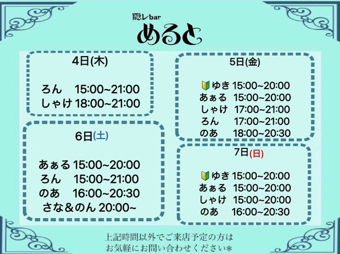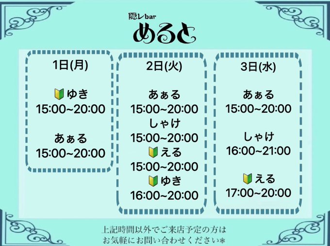 固定隠レbar めると@kakurebar_melt·1時間12月7日(日)迄の鍵開け予定表になります 🗝️🫧 🧊 キャストの出勤=お店のオープン時間♡ 🔰のキャストは、まだお仕事を覚えてる最中の見習いちゃんです🌙 心ばかりのご奉仕で…10分多めにお時間サービスさせていただきます💐 ※時間は前後することがあります!各キャストのSNSをチェックしてね📱引用隠レbar めると@kakurebar_melt·6月16日・*:.。 。.:*・゚✽.。.:*・゚・*:.。 。.:*・゚✽.。.:*・゚ 〜 めるとメニュー表 〜 ❅ セット料金.システムについて ❅ 飲み放題 or チャージ からお選びいただきます🫧 🍹ドリンクは飲み放題.チャージともに共通となっております⸝⋆ (ショットのみ別料金となります) お支払い方法は 現金 /21182