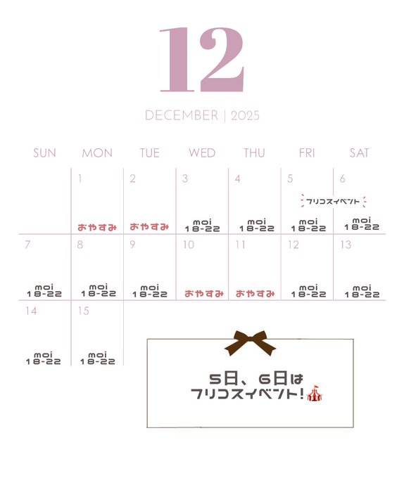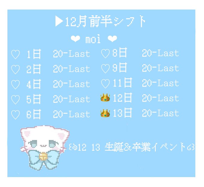 固定Moi 広島コンカフェ@Moi_nakanohito·🎀12月前半の出勤予定🎀 ✨5.6日フリコスイベント✨ ✨12.13日あお生誕&卒業✨ #コンカフェ #広島コンカフェ #広島 #moi #広島メイド52