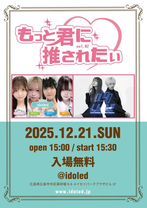 広島 idoledidoled@idoled082·無料ライブイベント 『もっと君に推されたい vol.2』 開催決定!! ゲストに『L.U.R.E』さんを迎え、初の対バンです✨ 【開催日】12月21日(日) 【会場】idoled 【時間】open 15:00 / start 15:30 【料金】0円 【出演】idoled(佐々木のあ/芽有あると/眠羽ゆう/樋宮にこ)/L.U.R.E 【チケット】さらに表示23272,440