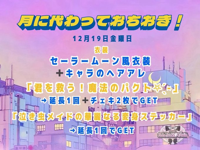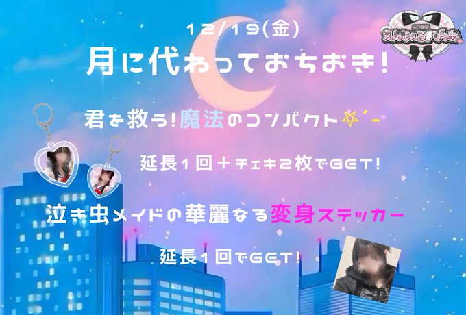 広島 えんじぇるぴゅあメイド喫茶 えんじぇる໒꒱ぴゅあ@angelpure_cafe·.·*.···············································⟡.·* 12/19(金) 月に代わっておちおき! 君を救う!魔法のコンパクト𖤐´- ▶︎延長1回+チェキ2枚でGET 沢山のご帰宅お待ちしております🌙 .·*.····················································⟡.·*13613
