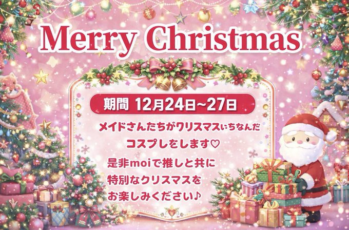 広島 MoiねるさんがリポストMoi 広島コンカフェ@Moi_nakanohito·12月後半のイベントはこちら❕❕ ⭐︎24~27日 クリスマスコスイベント メイドさん達がクリスマスにちなんだコスプレ姿でご主人様、お嬢様をお待ちしております💖 ⬇️詳しくは画像をチェック✨2260