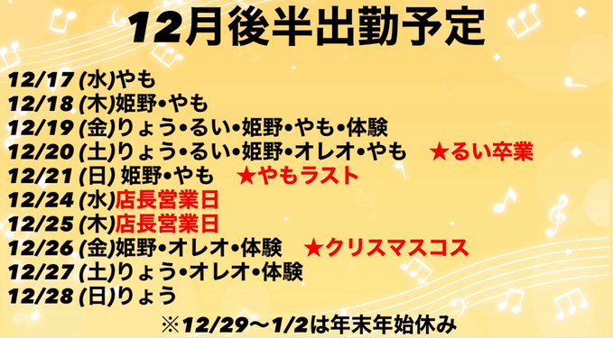 広島 ROCKCUNESTAR-ろっきゅんすたあ-固定ロックコンカフェ ROCKCUNESTAR@ROCKCUNE·【出勤・イベント情報】 12月後半はこちら! 🎸12/20はるい卒業! 🎸12/21はやも期間限定復活最終日! 🎸12/26はクリスマスコスday! 12/29〜1/2は年末年始休みとさせていただきます 1月から新キャスト増えます! 体験も3名います🔥 ❤️🔥求人募集中❤️🔥 #広島コンカフェ #ロックコンカフェ #ロックバー1149