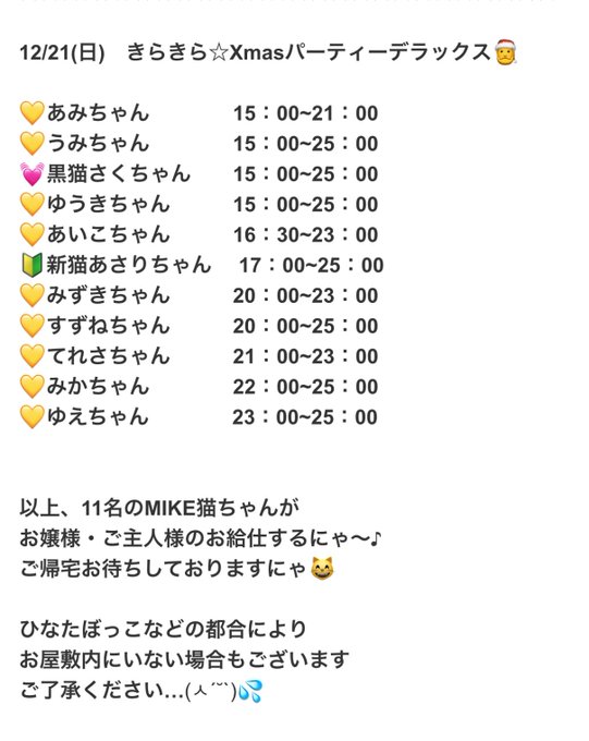 広島 ミケカフェ広島店MIKECAFE(ミケカフェ)@MIKE_NOMINE·本日も15時から多くのご主人様、お嬢様のご帰宅お待ちしてますにゃ😽 今年もあと10日〜!4173