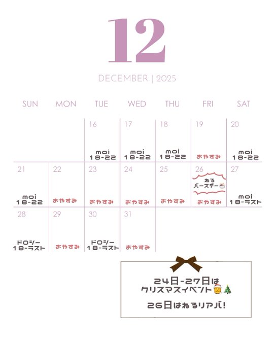広島 Moi固定ねる@0neru_moi0·🌟12月後半のお給仕予定🌟 26日は私のお誕生日です(>ω