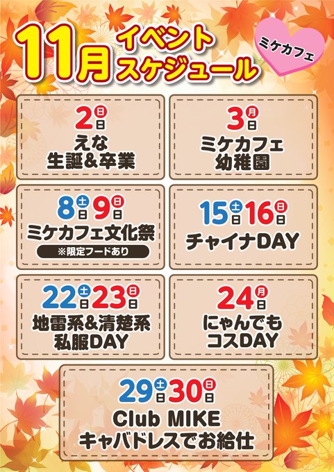 広島 ミケカフェ広島店 広島 ミケカフェ広島店MIKECAFE(ミケカフェ)さんがリポストゆえ@ミケカフェ@YUeee_mike·8時間~11月の予定~ ♡→おーらす日 今月は久々に黒猫も出るかもしれないです…… イベントも気合い入れます!!引用MIKECAFE(ミケカフェ)@MIKE_NOMINE·10月9日11月イベントのお知らせだにゃん🐈1118827 10月29日 16:37