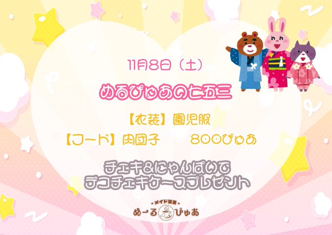 広島 メイド喫茶めーるぴゅあ 広島 メイド喫茶めーるぴゅあメイド喫茶 めーる໒꒱ぴゅあ@merpure_cafe·10月29日໒꒱すいようび ☕️お給仕情報☕️ ⋱⋰ ⋱⋰ 19-23 リカ 19-0 うさ 19-2 ぽこ太郎 20-23 モナ 20-1 聖華 20-2 かなた 21-0 ぽむ ⋱⋰ ⋱⋰ 7人のメイドさんがご主人様お嬢様のご帰宅お待ちしてます❣️🧸 #めるぴゅあ1116 10月29日 15:02