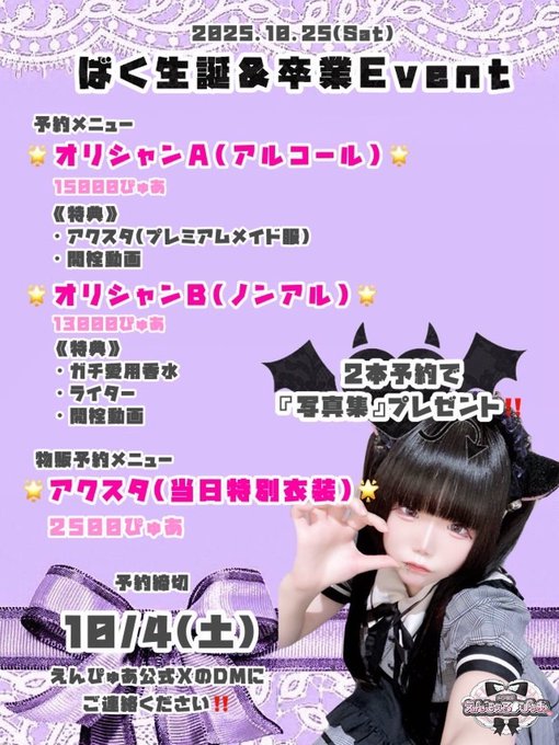 メイド喫茶 えんじぇる໒꒱ぴゅあさんがリポストばく@えんぴゅあ ♡10/24.25 生誕&卒業♡@angelpure_baku·6時間きょうの営業終わりまで❕ ぜぇーーーーったい忘れないで❕引用メイド喫茶 えんじぇる໒꒱ぴゅあ@angelpure_cafe·9月23日🎀イベントお知らせ🎀 🖤10/25(土)ばく生誕&卒業🖤 オリシャンとアクリルスタンドを予約販売します‼️ 本日から10/4(土)までに本数とお名前を明記の上、えんぴゅあ公式XのDMまでお願いします❕ 沢山のご帰宅お待ちしております🤍126609