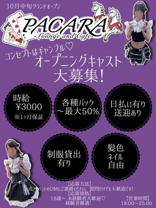 さなぱっちょさんがリポストPACARA広島🎰コンセプトCafe&Lounge@PACARA_hrsm·新規オープンにつきキャスト大募集! ✧••┈┈┈┈┈┈••✧ ✦広島流川エリア ✦時給¥3000 ✦日払い、送迎、制服貸出有り ✦18歳~ 未経験者大歓迎! ✦経験者優遇有り! ご応募はこちらのアカウントのDMまで! ✧••┈┈┈┈┈┈••✧ #広島コンカフェ #コンカフェ #コンカフェ求人34203