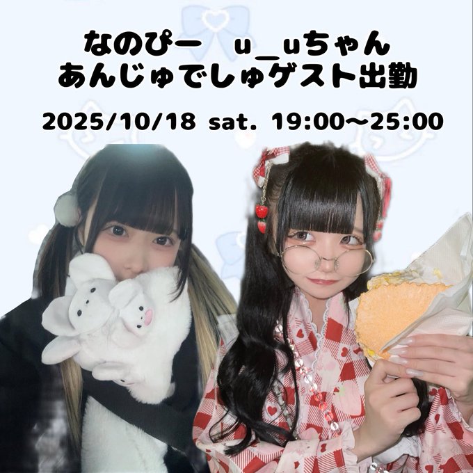 さなぱっちょ@Sana_pa_37·3時間やば引用Ange déchu🪽広島コンカフェあんじゅでしゅ@monangedechu·3時間˚*.꒰ ゲスト出勤のお知らせ ꒱.*˚ 🧸2025.10.18 sat. 19:00~25:00🧸 🪽なのぴー@iLiFE_suzume 🪽u_uちゃん@4Npyuz 2人がゲスト出勤してくれます〜! たくさんのご来店お待ちしております! #広島コンカフェ #あんじゅでしゅ41,183