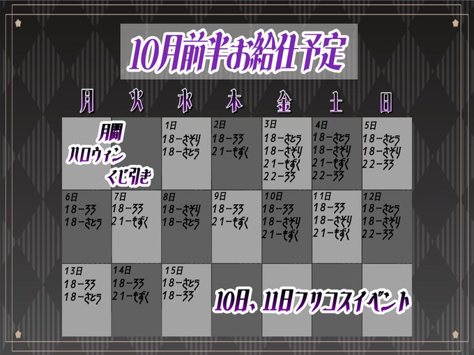 固定ネオ・パーのダチ・もずく@p__u_u_·7時間出勤とイベント情報です 見といてクレメンス引用♱ Dorthy ドロシー ♱@dorthy_1115·10月1日⚖️10月前半の出勤予定⚖️ 10.11.24.25.31日✨フリコスイベント✨ 月間✨ ハロウィンくじイベント ✨ #コンカフェ #広島コンカフェ #ドロシー #Dorthy #広島メイド2336