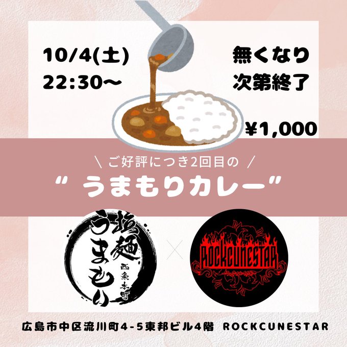 りょう🐋さんがリポストラーメンうまもり西条本店@ramen_umamori·【お知らせ】 うまもり西条本店10月予定表です! ROCKCUNESTAR様(@ROCKCUNE)にてフード出店させていただきます!カレーやるぜ🍛 11(土)酒まつり 特別営業 12(日)酒まつり 特別営業 13(月▪️祝) 店休日 そして大人気限定メニュー【辛うま汁なし】がレギュラー化! 詳しくは画像check ご確認ください🥲1791,398