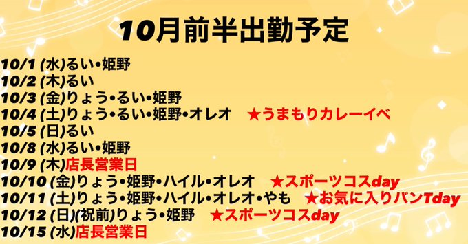 りょう🐋@ryo_ROCKCUNE·8時間10/4(土)うまもりカレー🍛💓 10/11(土)おかえりやもすけ!🦎💗&バンT 10/10(金)12(日)スポーツコス🎽 イベントてんこ盛りや〜🫶💞🫶引用ロックコンカフェ ROCKCUNESTAR@ROCKCUNE·8時間【出勤・イベント情報】 10月前半こちら! 🎸10/4は大好評につき2回目のうまもりカレーイベ! 🎸10/10.10/12はスポーツの日間近のスポーツコスday! 🎸10/11はスパロ広島開催のためお気に入りバンTday! それぞれのイベント概要は添付画像にて! ❤️🔥求人も募集中❤️🔥 #広島コンカフェ #ロックコンカフェ3201